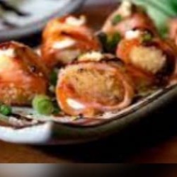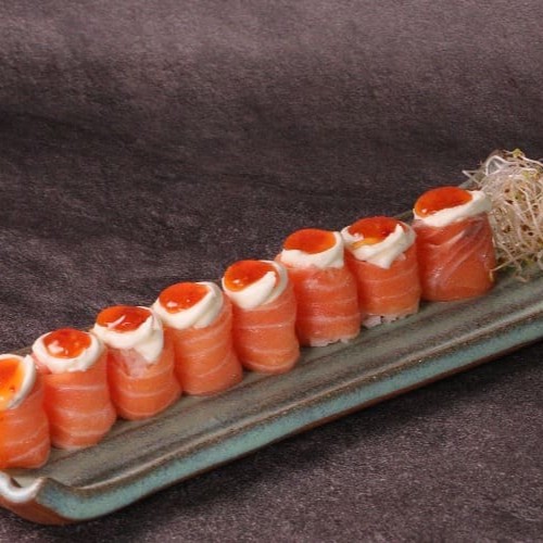 Fitas de salmão enrolado no camarão com cream cheese e cebolinha, maçaricado e finalizado com tarê e gergelim. (Sem Alteração)