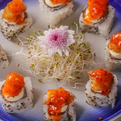 Sushi flambado a moda da casa com raspas de limão siciliano e cream cheese. (sem alteração)