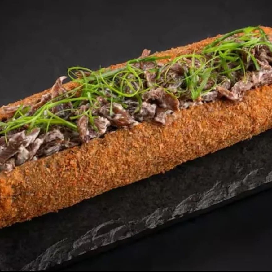 Hot empanado cortado ao meio, recheado com shimeji e cream cheese finalizado com cebolinha, tarê e gergelim. (sem alteração)
