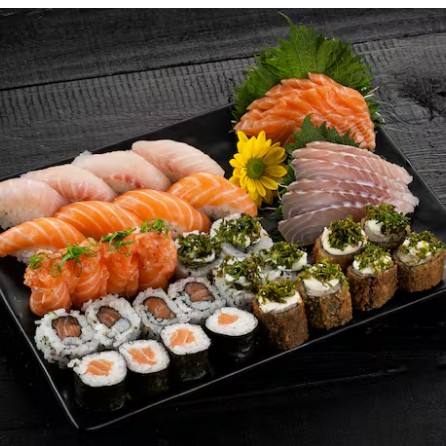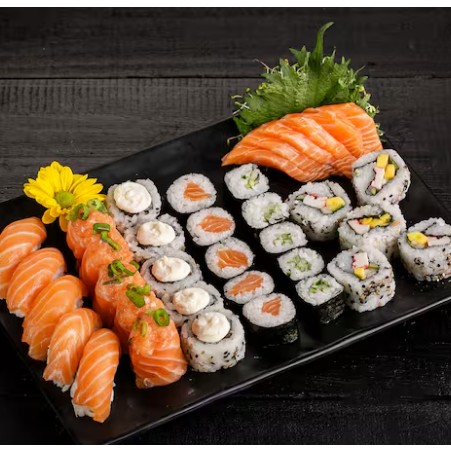 1 temaki de salmão batido 8 sashimis 12 sushis variados igual da imagem 1 salmão grelhado 1 mini porção de shimeji 2 guiozas 4 harumaki de queijo