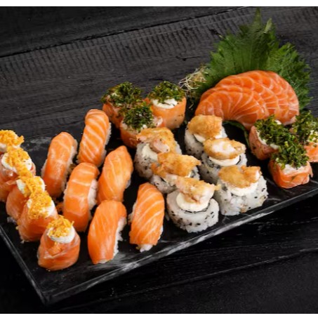 6 sashimi de salmão 5 niguiri de salmão 5 jhou de salmão 5 uramaki de salmão com cream cheese 5 hossomaki de salmão 6 hot holls (sem alteração) Deixe sua avaliação no sobre esse pedido, sua avaliação 5 estrelas vai nos ajudar bastante ;)
