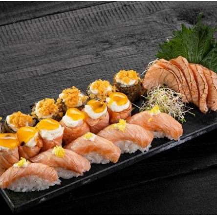 8 jhou de salmão maçaricado 6 niguiri de salmão maçaricado 5 sashimi de salmão maçaricado sem alterações !!! Deixe sua avaliação no Ifood sobre esse pedido, sua avaliação 5 estrelas vai nos ajudar bastante ;)