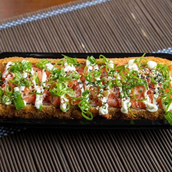 Descubra o sabor único do nosso Neste sushi requintada, finas fatias de salmão fresco e suculento abraçam delicadamente um leito de arroz de sushi, primorosamente preparado. O toque inovador, que confere ao salmão uma textura ligeiramente crocante por fora, mantendo-o macio por dentro.