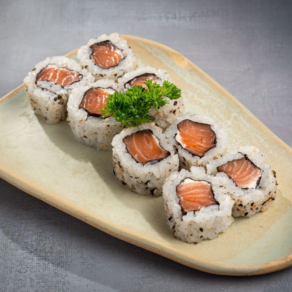 Apresentamos a voçê a seleção da categoria de 8 unidades, Trata-se de um primoroso uramaki, cujo exterior é ricamente coberto por um mix de arroz e gergelim, conferindo uma textura crocante e saborosa. Dentro, encontramos um generoso recheio de salmão fresco, cuja qualidade é inegável, acompanhado por um suave e cremoso cream cheese. A combinação desses ingredientes proporciona um paladar único, m
