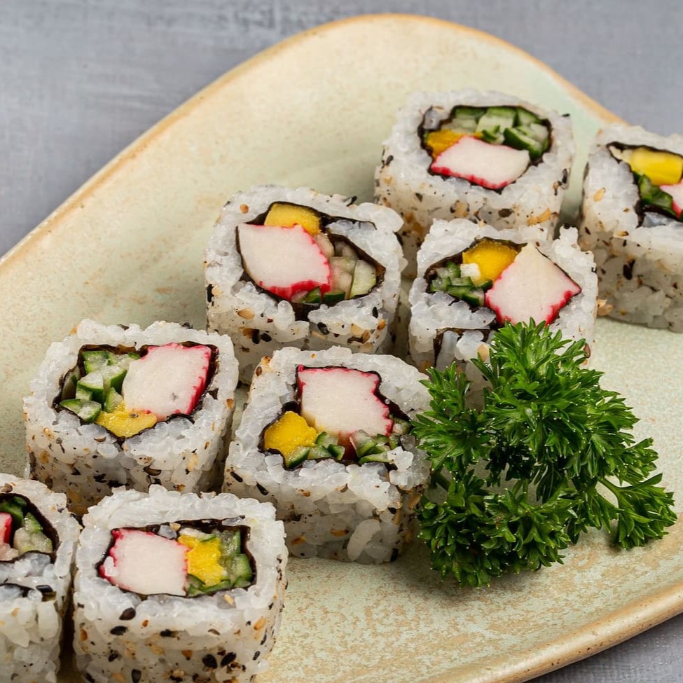 Delicie-se com o nosso uramaki Califórnia, uma porção generosa com 8 unidades. Este sushi é primorosamente enrolado com o mais fresco e pegajoso arroz, salpicado com gergelim torrado para um aroma e textura inigualável. Dentro, você encontrará um recheio vibrante e refrescante de manga suculenta, pepino chocante e kani saboroso. Uma mistura perfeita de sabores e texturas que irá surpreender e enca