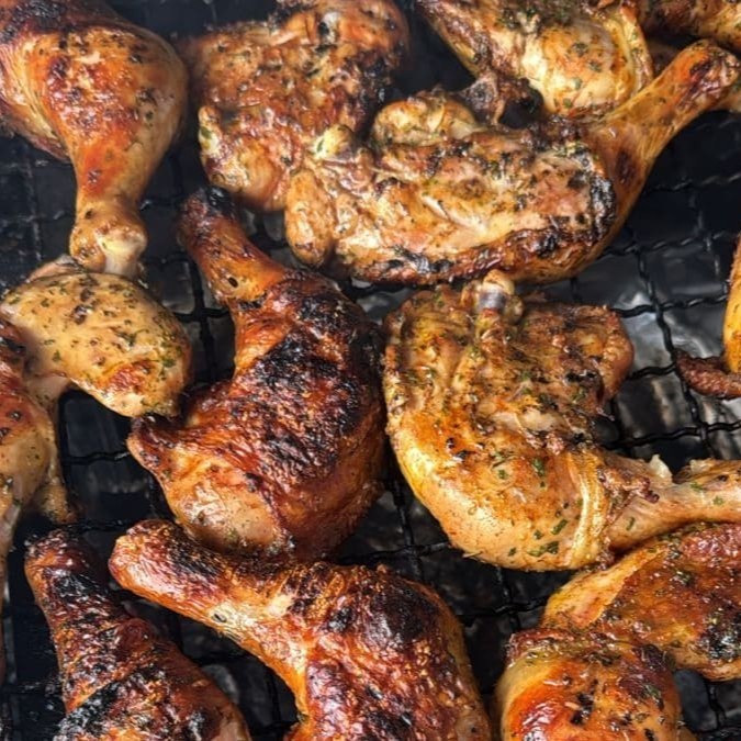 Suculentas coxas e sobrecoxas de frango cuidadosamente temperadas com especiarias selecionadas e ervas aromáticas. Assadas lentamente até ficarem douradas por fora e macias por dentro, revelando uma carne úmida e cheia de sabor. Perfeito para acompanhar arroz, saladas ou aquele almoço de domingo especial.