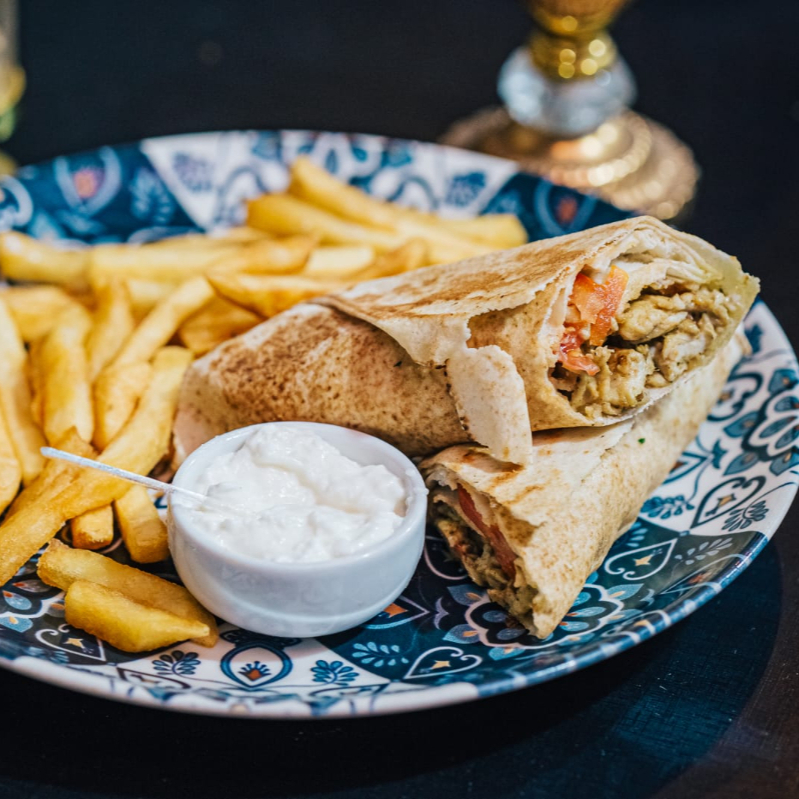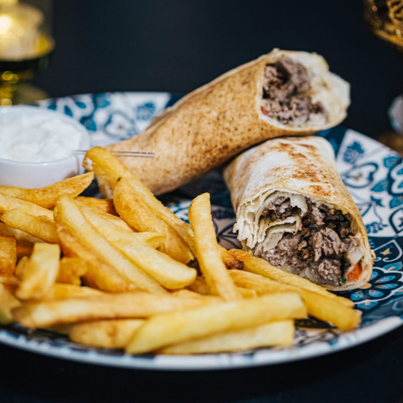 (pão folha, kafta, salsa, cebola, picles, pasta homus) + Batata Frita