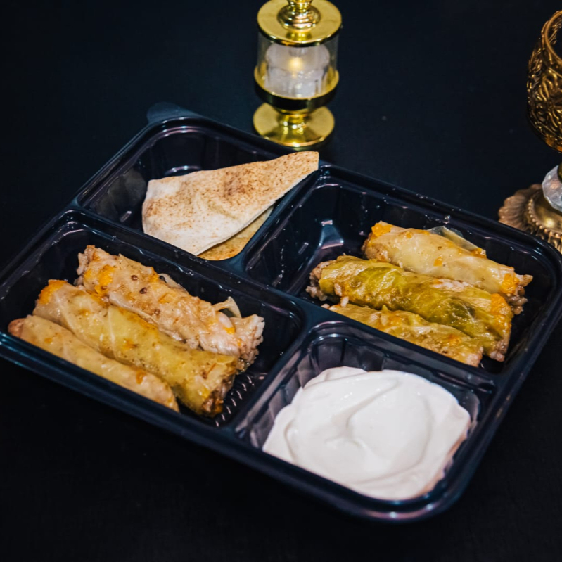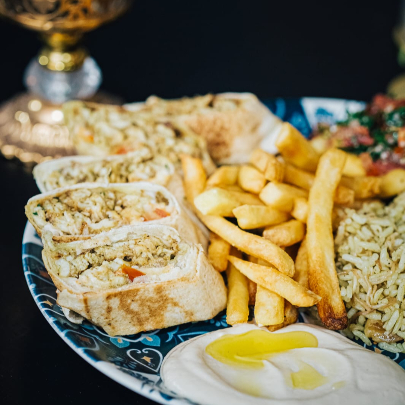 (shawarma de frango, arroz com cabelinho de anjo, batata, homos, fatuch)
