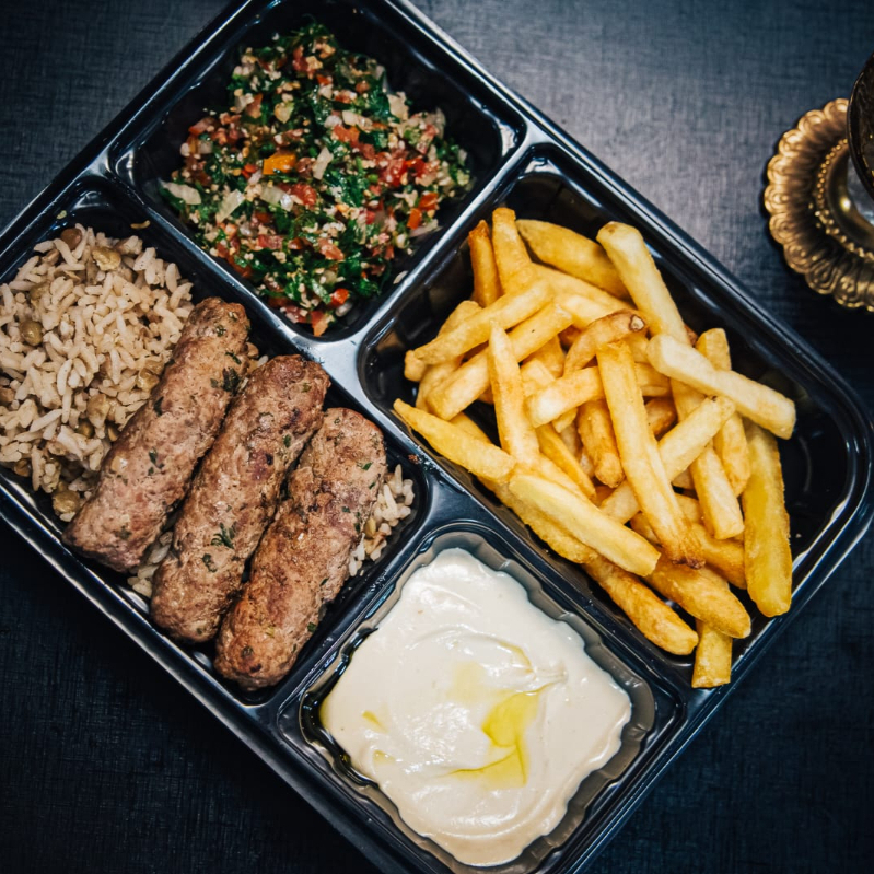 (arroz com cabelinho de anjo, tabule, homus, 3 espetos de kafta, pão sírio e batata)