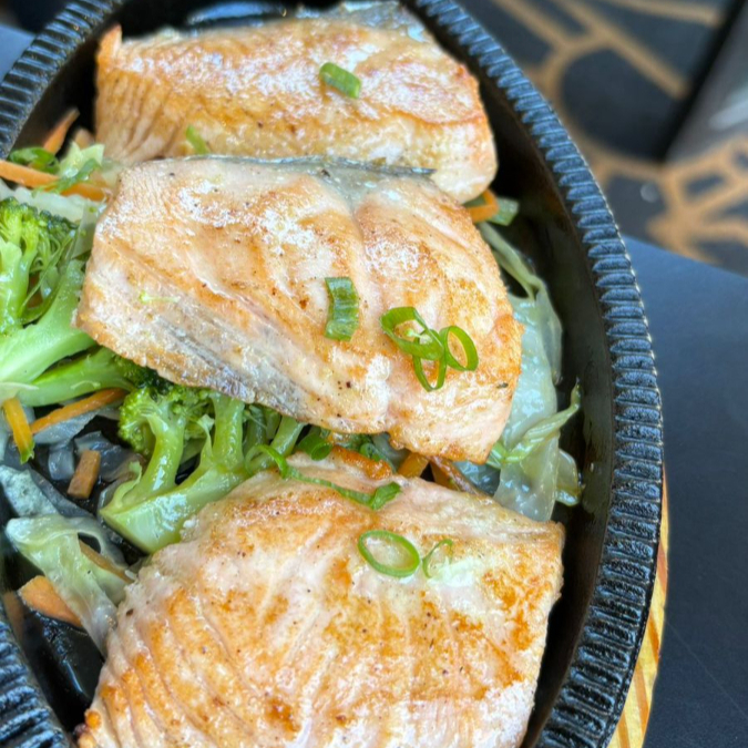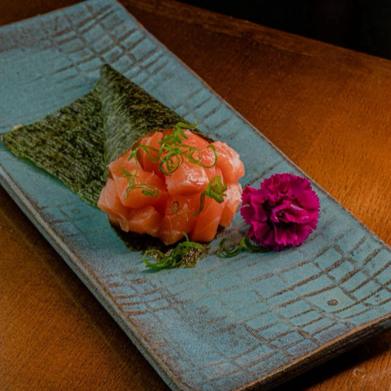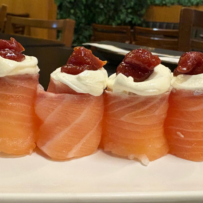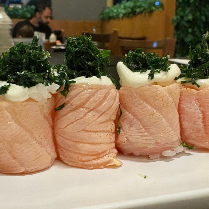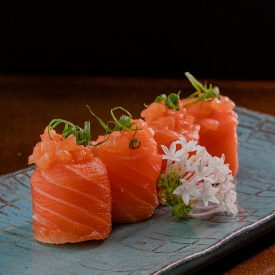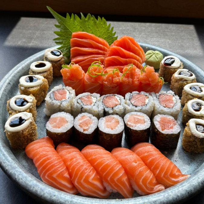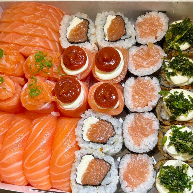 6 sashimi de salmao ,5 hot,4 joe salmao 4 nigiri salmo 4 uramaki skin 4 hossomak, 5 uramaki grelhadofatias salmãosalmao