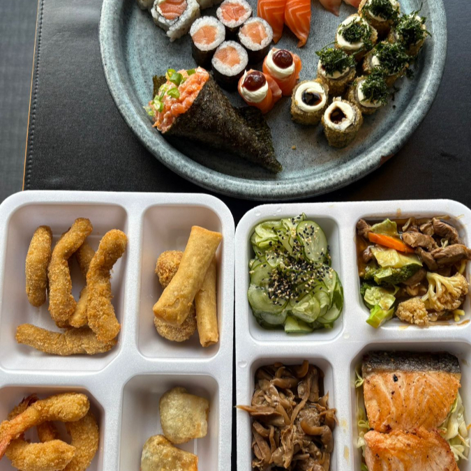 rodizio familia, sunomono, yakisoba. 2 salmao grelhado, shimeji, 2 harumakis , 2 croquetes de salmao,4 camarao a dore, 4 lulas a dore, 2 guiozas. 6 sashimis salmao , 8 hot roll, 2 joe geleia, 4 uramaki , 4 hosomaki , 2 niguiri salmao , 2 niguiri tilapia, 1 mini temaki.