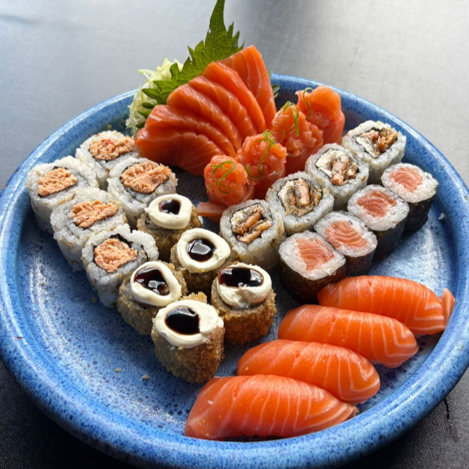 4 sashimi salmao, 4 niguiri, 4 hosomaki, 4 uramaki, e 6 hot holl