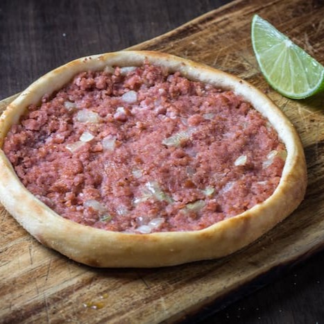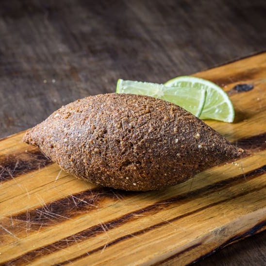 Carne moída temperada com trigo fino, cebola, cebolinha e hortelã.