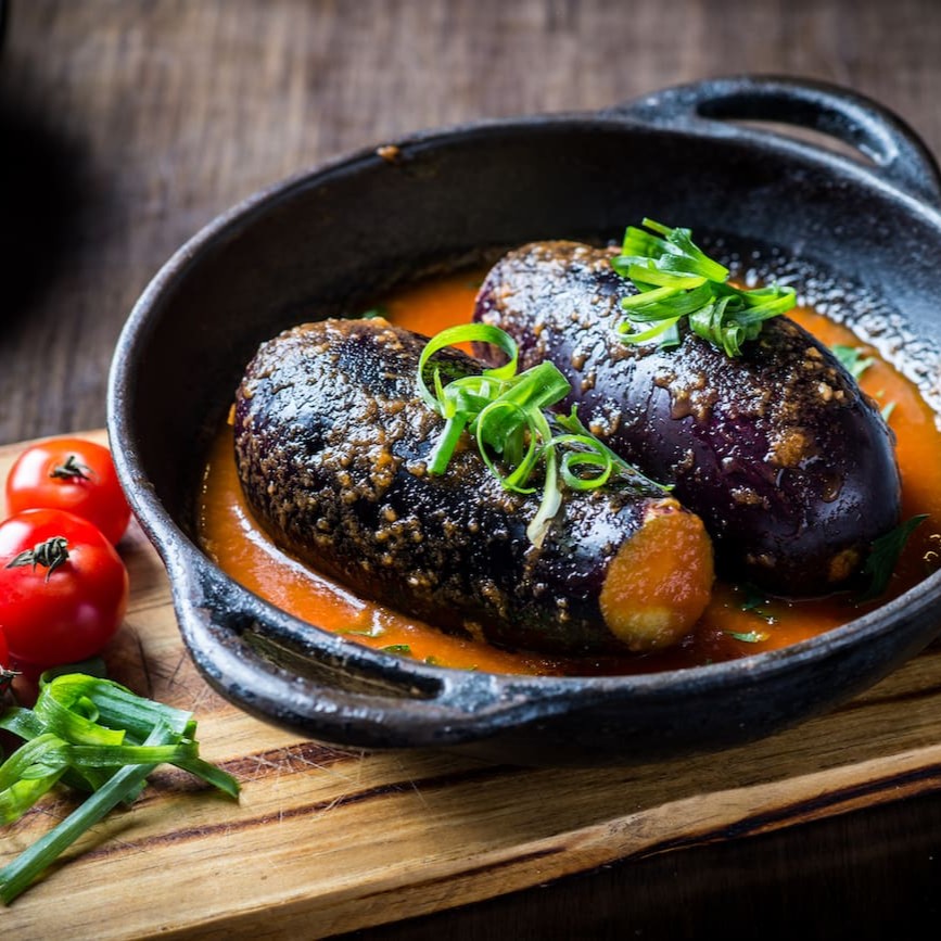 Berinjela recheada com arroz, proteína de soja e tempero árabes cozida ao molho de tomate.