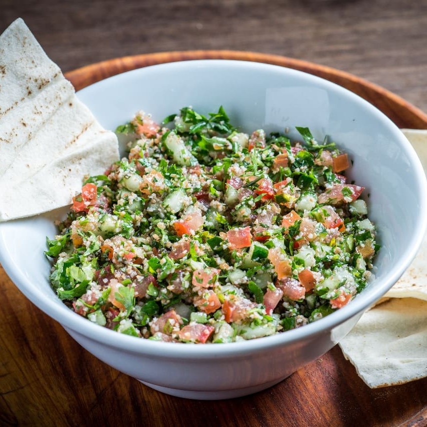 Salada de pepino, tomate, hortelã, salsinha e trigo.