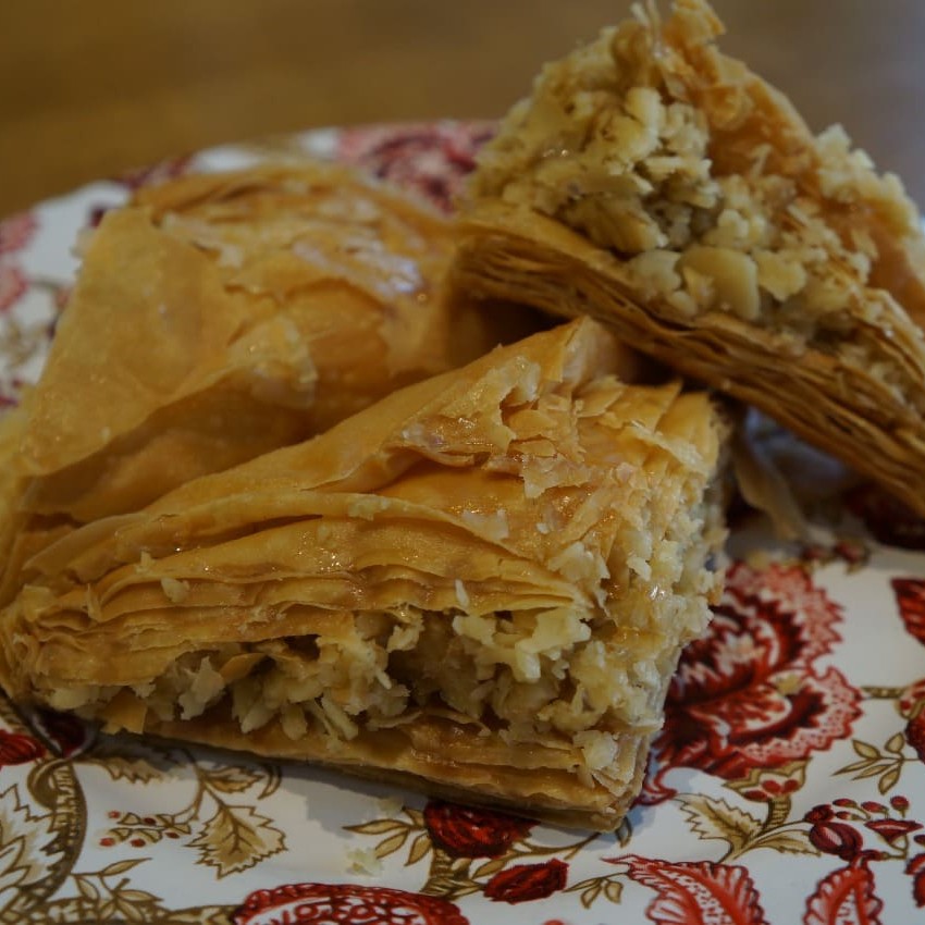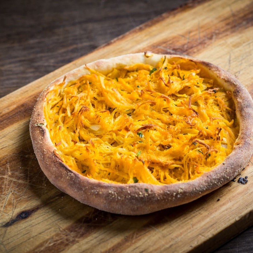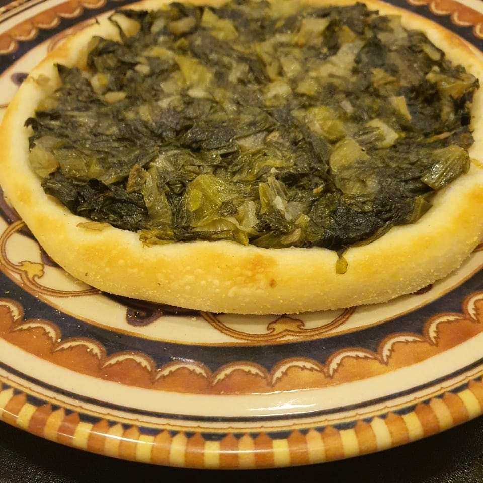 Abóbora, trigo fino, hortelã e tempero árabe, recheado com escarola e nozes.