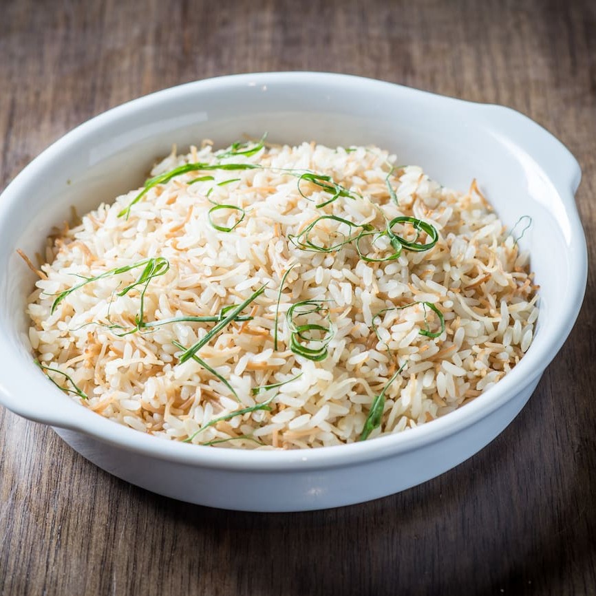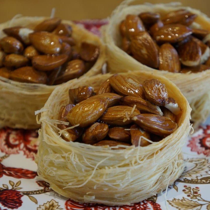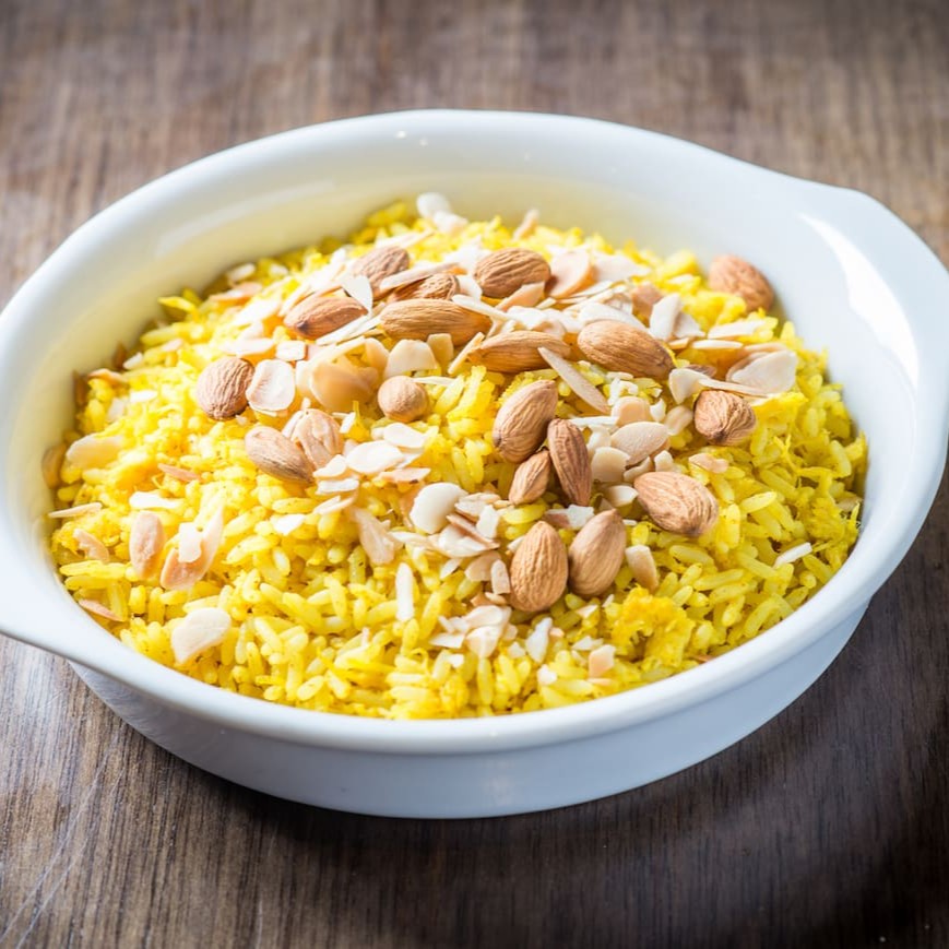 Arroz refogado com peito de frango e temperos árabes coberto com amêndoas.
