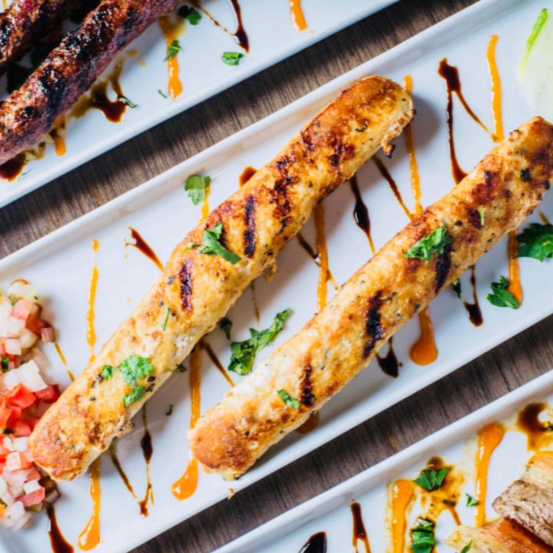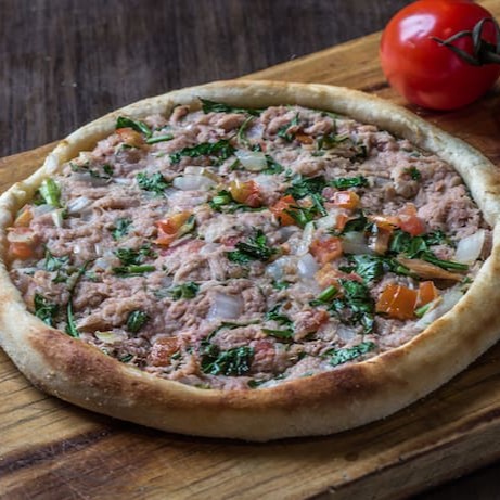 Carne de cordeiro moída, temperada à moda libanesa e assada com salsinha, acompanha vinagrete.