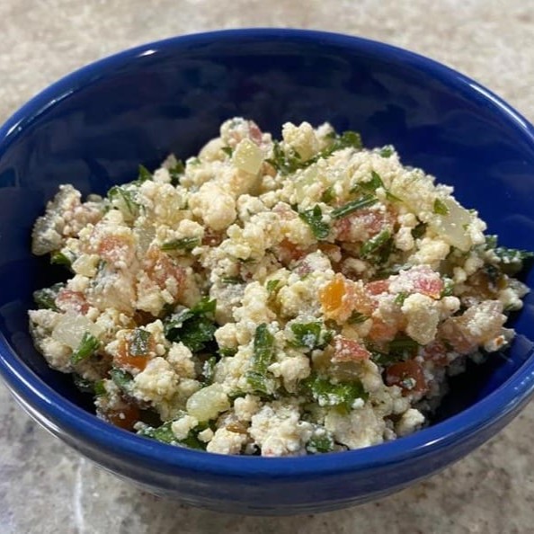 Carne de frango moida , temperada à moda libanesa e assada com salsinha, acompanha vinagrete.