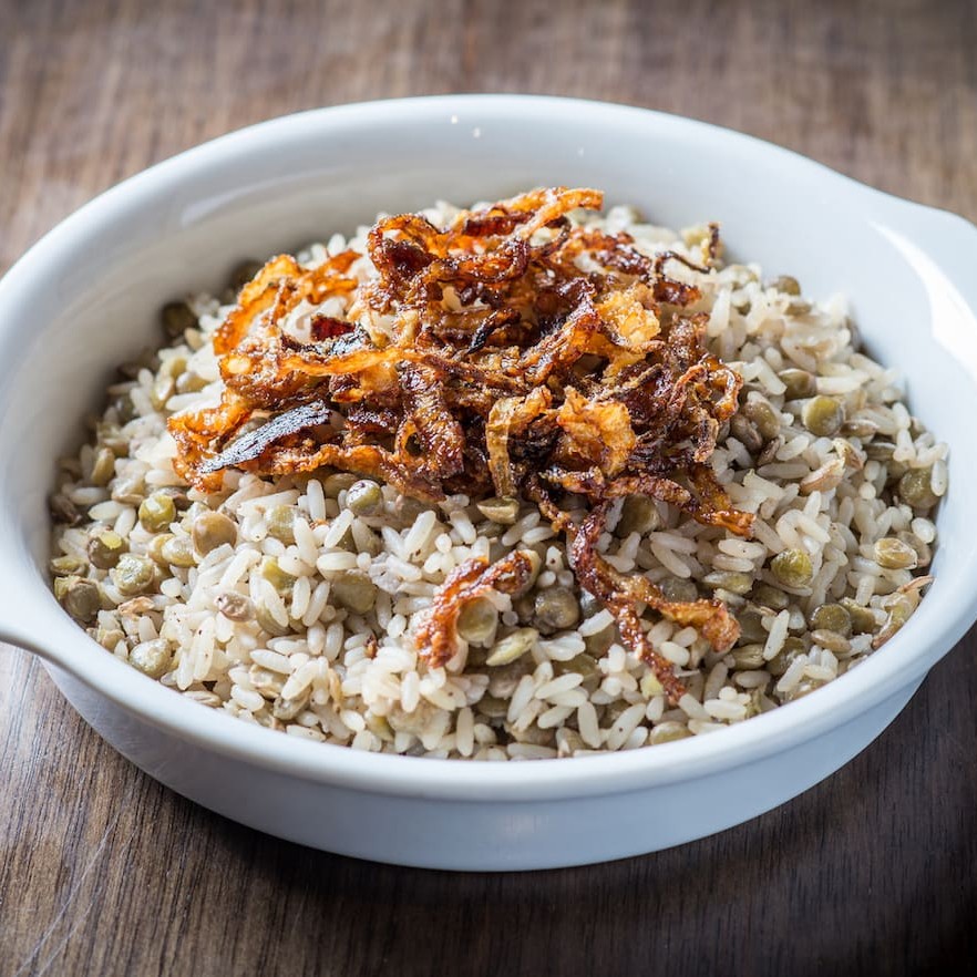 Acompanha nosso delicioso Arroz Mjadra (com lentilha e cebola frita) e a Salada Khadije.