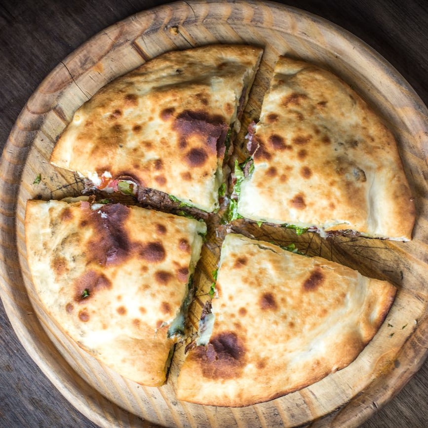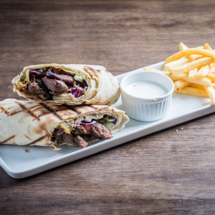 Filét mignon ou frango, tomate, pepino, repolho roxo, batata frita, molho de alho, enrolado no pão da casa.