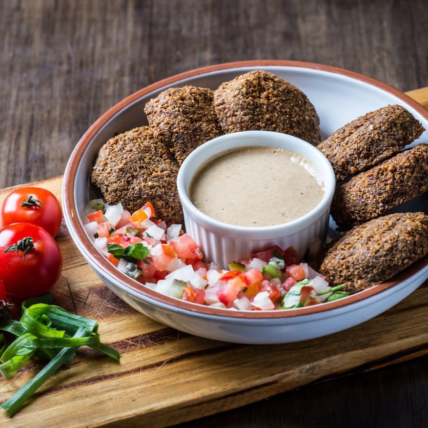 4 ou 8 unidades - bolinhos fritos de grão de bico e fava, acompanha vinagrete e molho tártaro