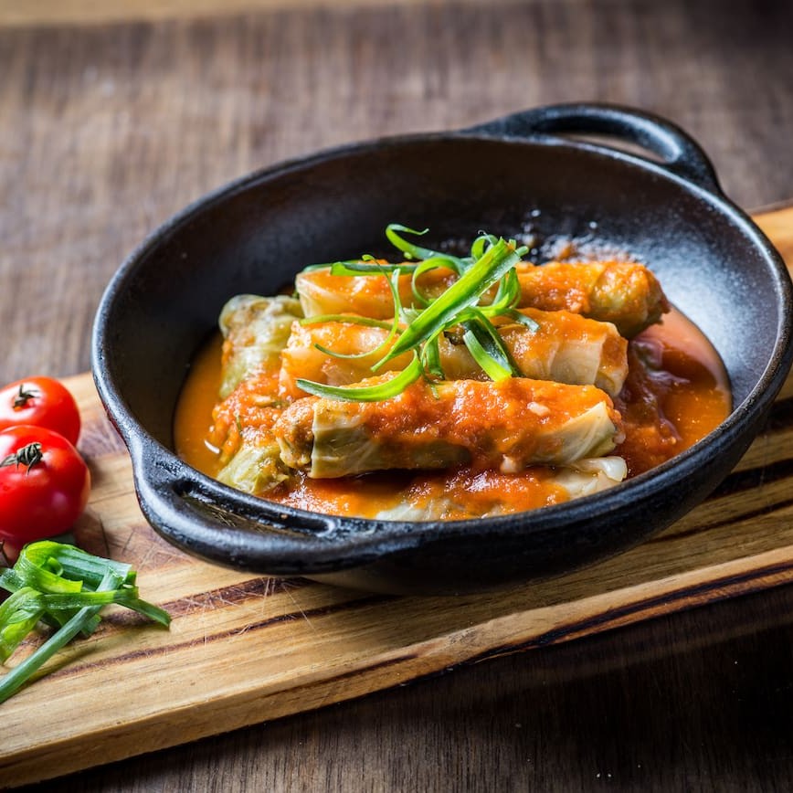 Folha de repolho recheada com arroz, carne moída e temperos árabes.