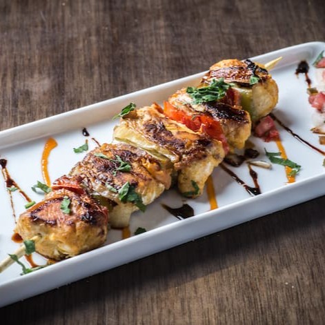 Espeto árabe de filet de frango intercalado com cebola e tomate grelhados.