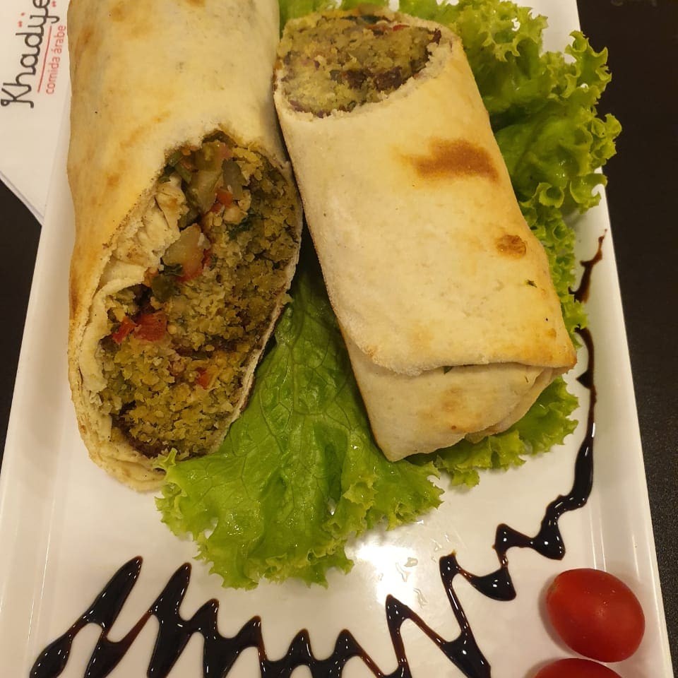 3 bolinhas de falafel, molho taratur, vinagrete e temperos, enrolado no pão da casa.