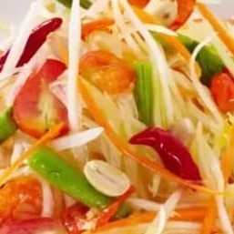 macarrao de mamao picado, tomate, limao, alho, vagem