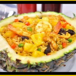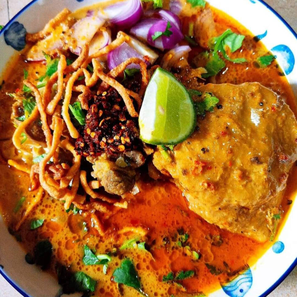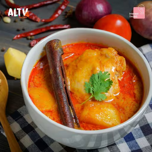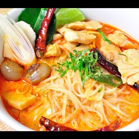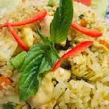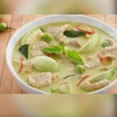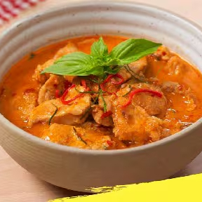 ARROZ COZIDO COXA DE FRANGO PASTA DE CURRY VERMALHO DE PIMENTSADE PEIXE, BERINJELA, FOLHAS DE LIMAO