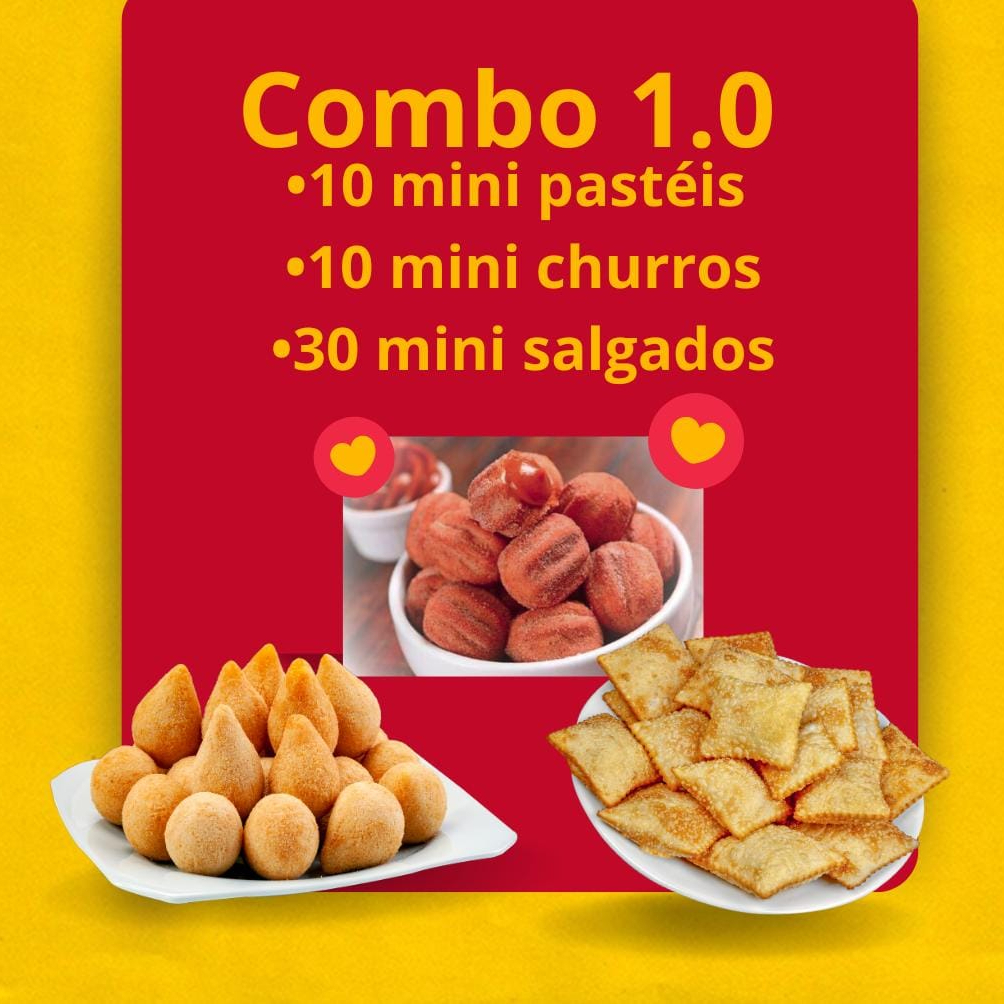 30 salgados + porção de pasteis 10un (carne, queijo e frango c/ Catupiry, presunto com queijo e calabresa com queijo) + porção de mini churros 10 un.