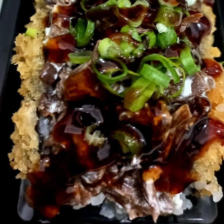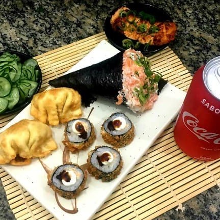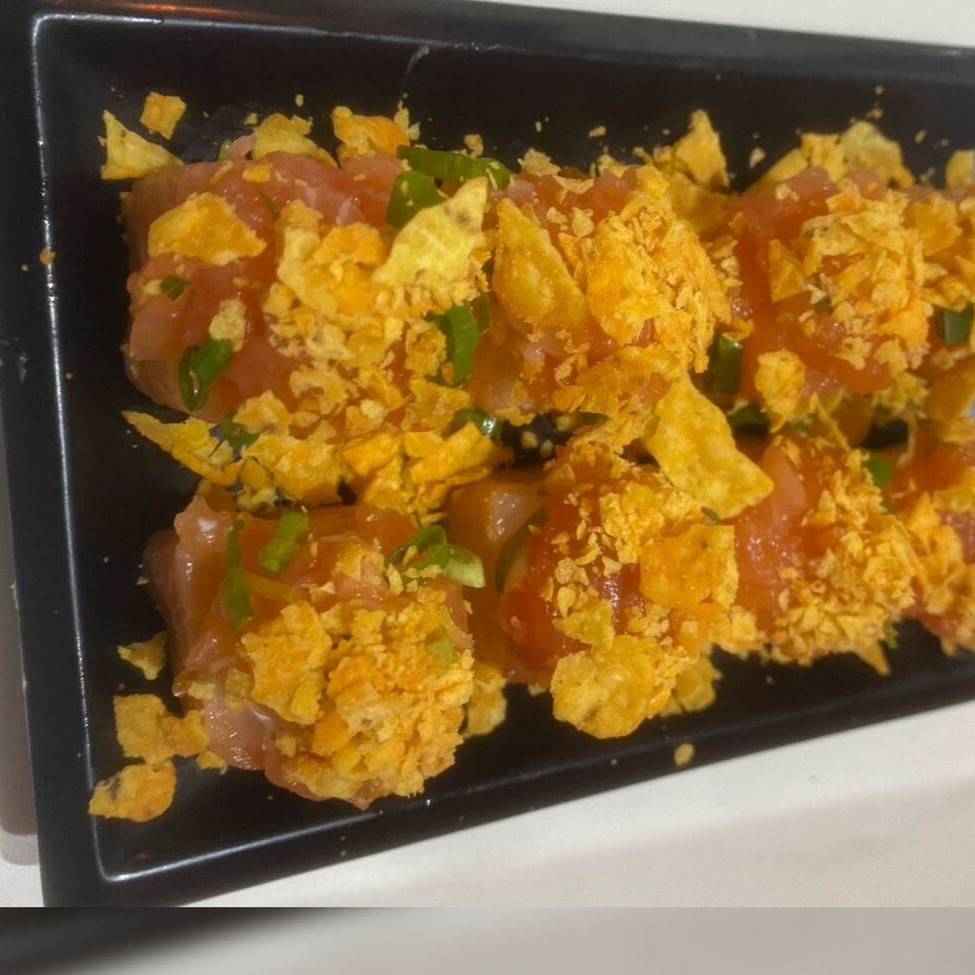 Salmão, arroz, nori, cream cheese, Doritos e Tabasco.