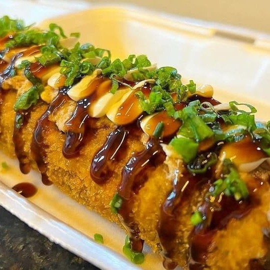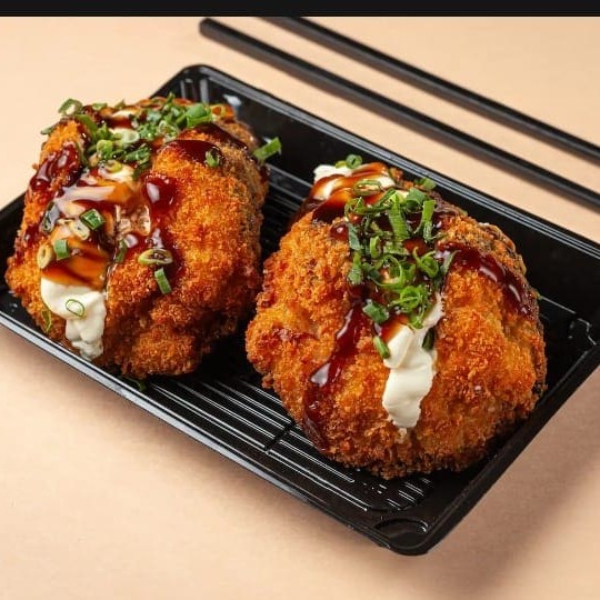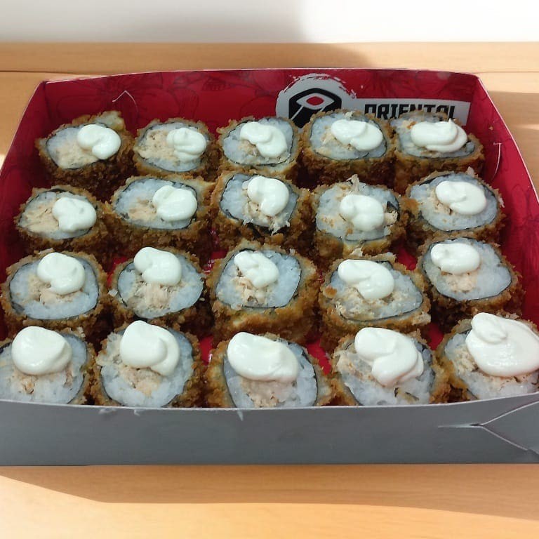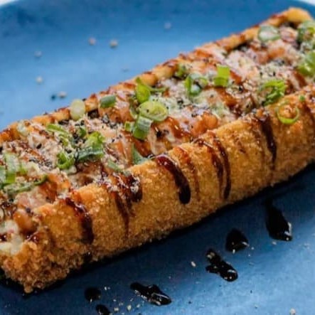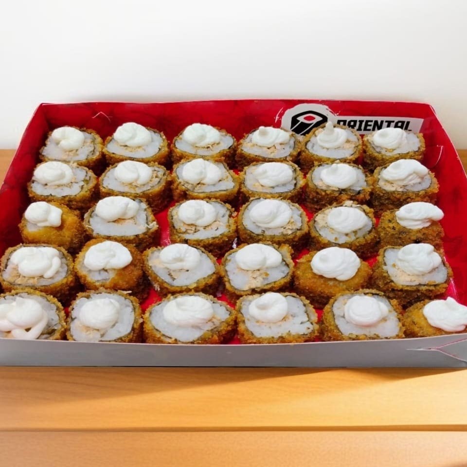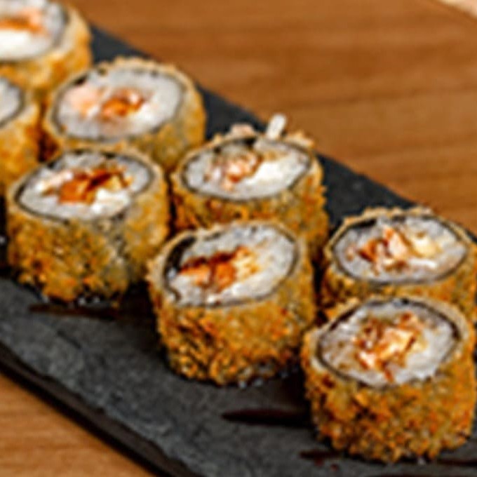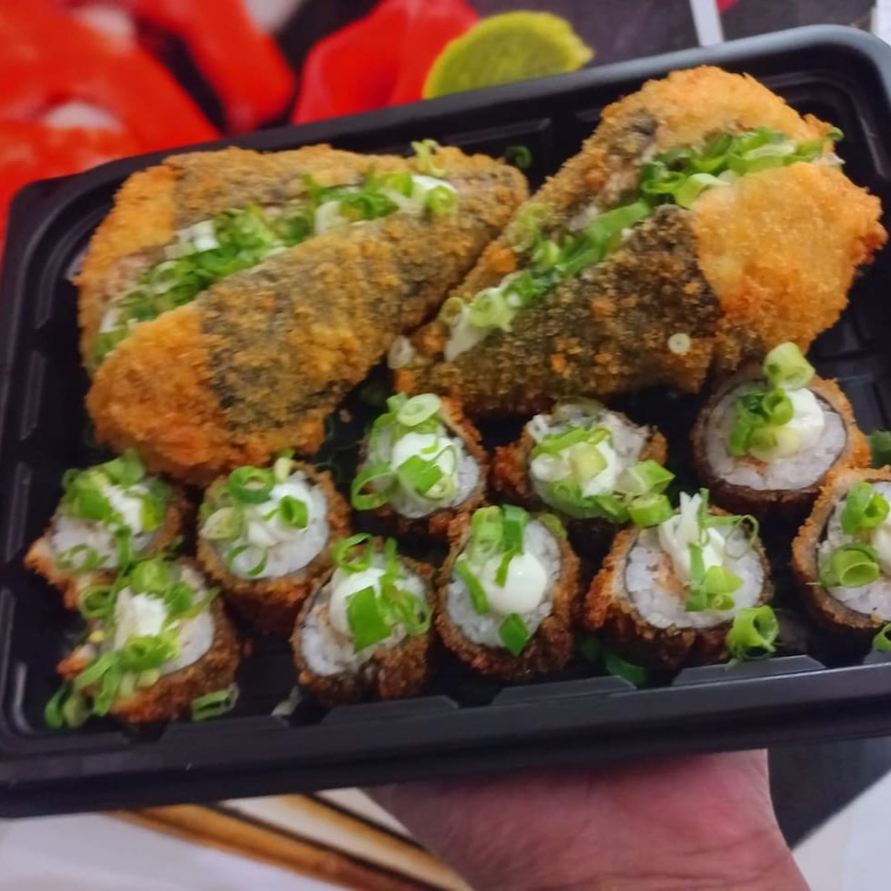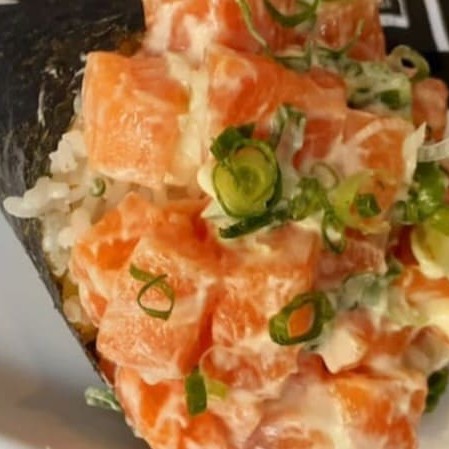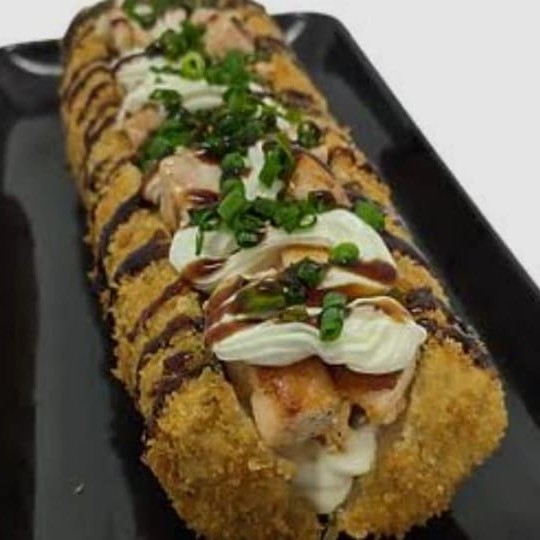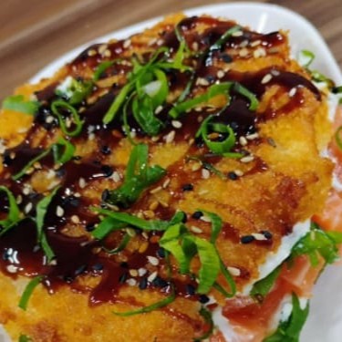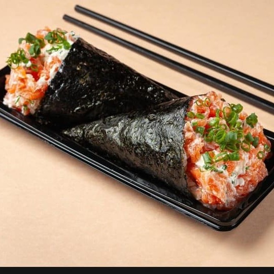 2 temaki salmão grelhado, cream cheese cebolinha, arroz nori, empanado e frito.