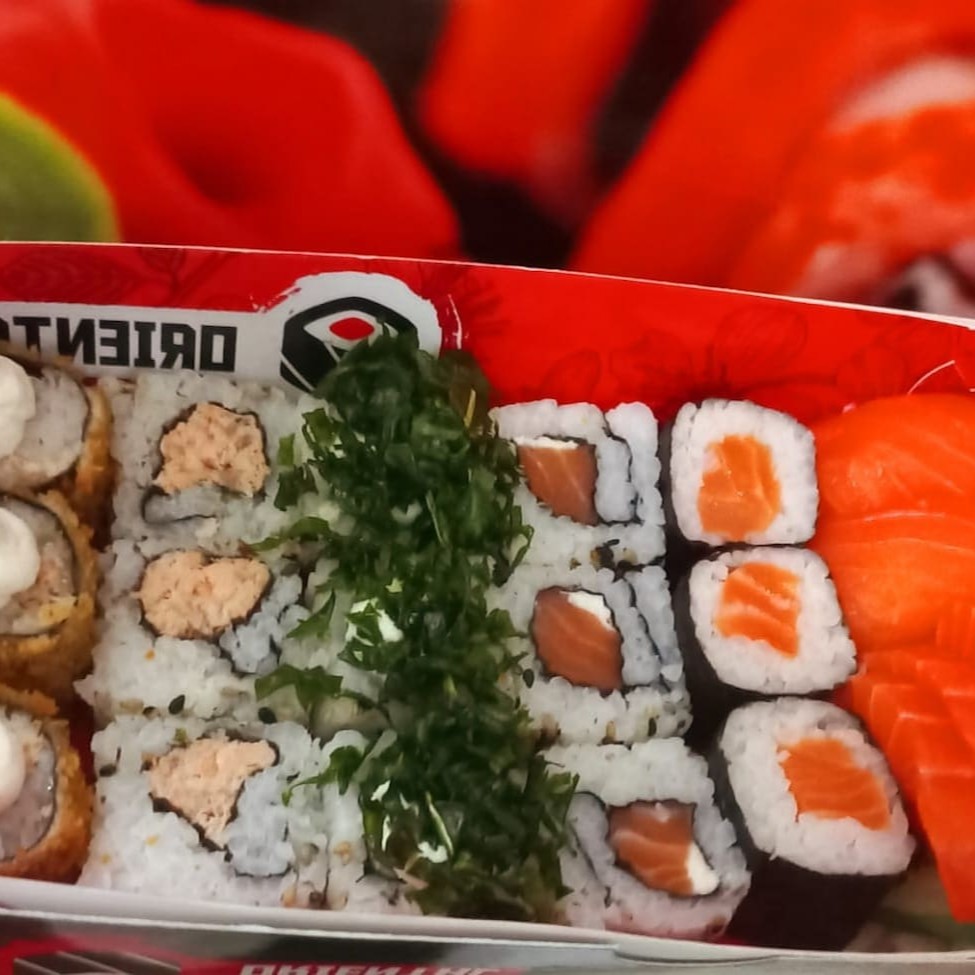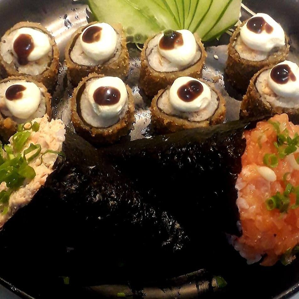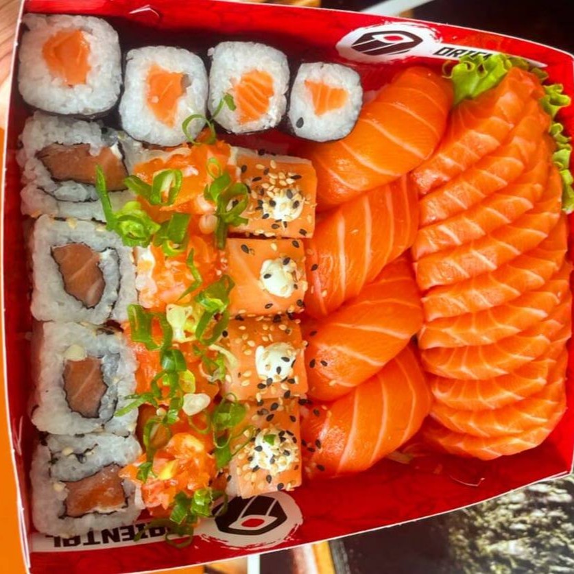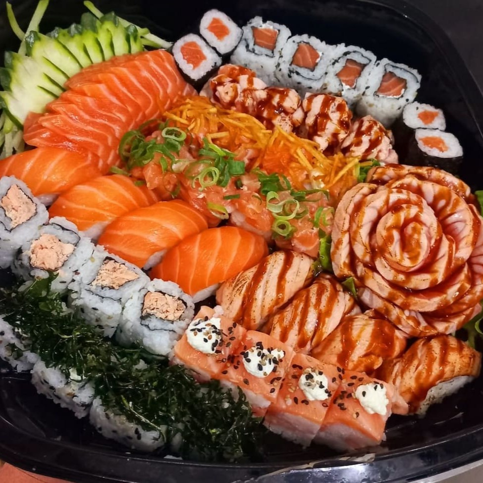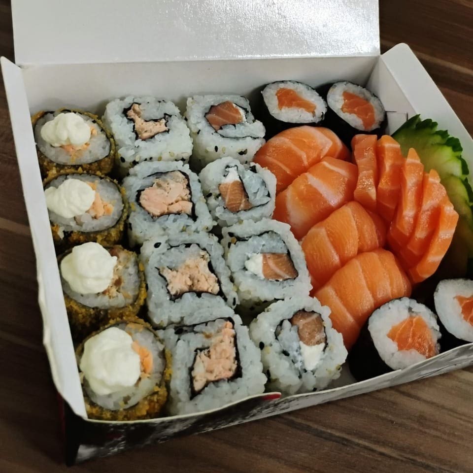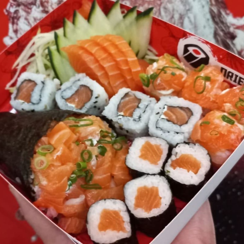 3 sashimi salmão, 3 uramaki salmão,3 hossomaki salmão , 3 hot roll, 2 niguiri salão 3 uramaki skin,3uramaki Philadelphia