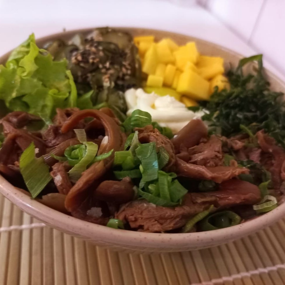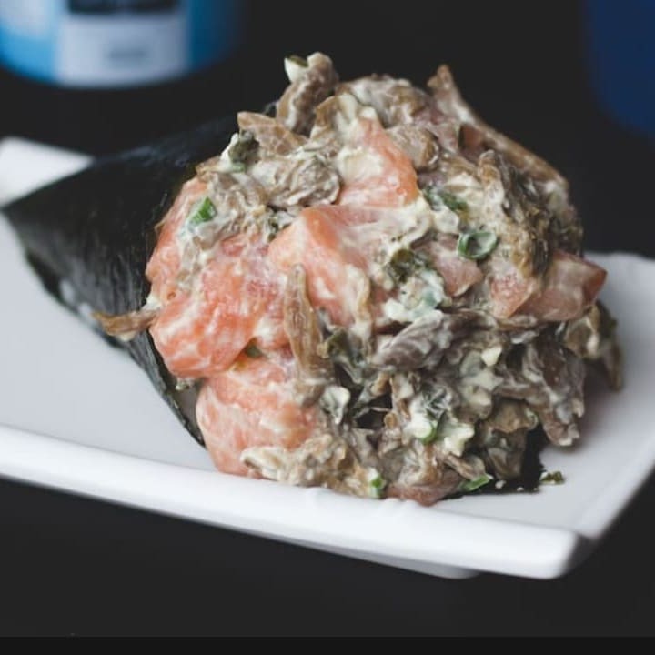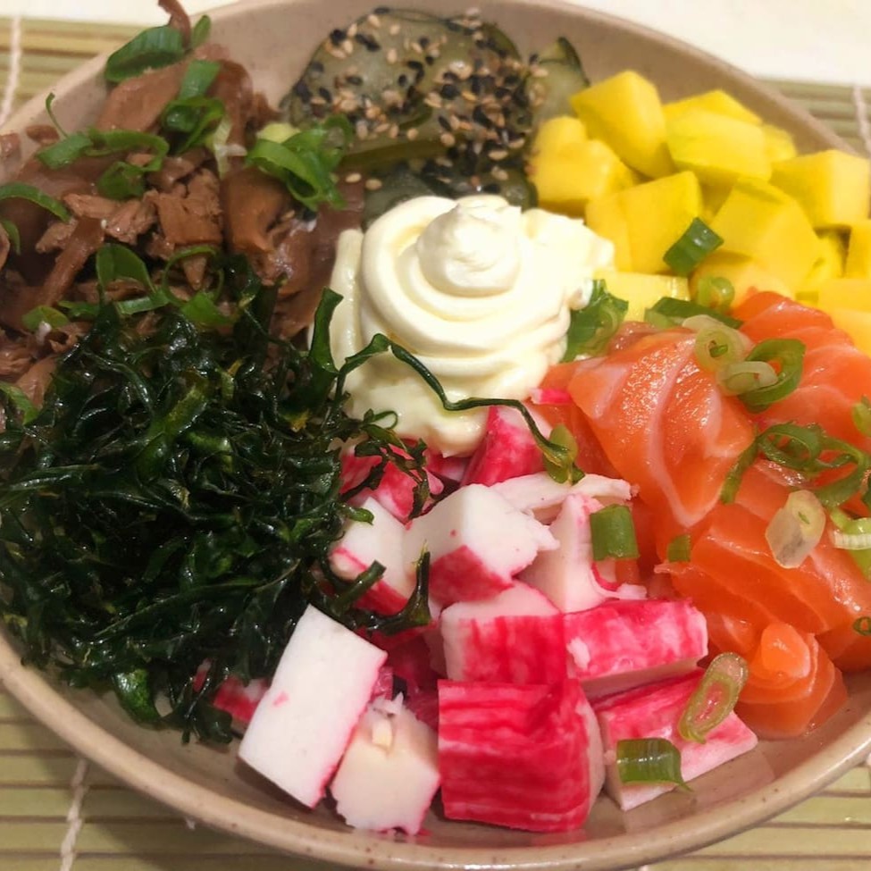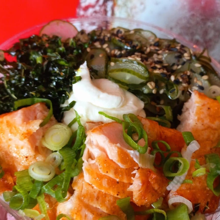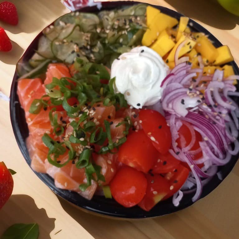 Base Arroz japonès) salmão em cubos,manga, sunomono, cebola roxa, tomate cereja, cebolinha, gergelim, e cream cheese.