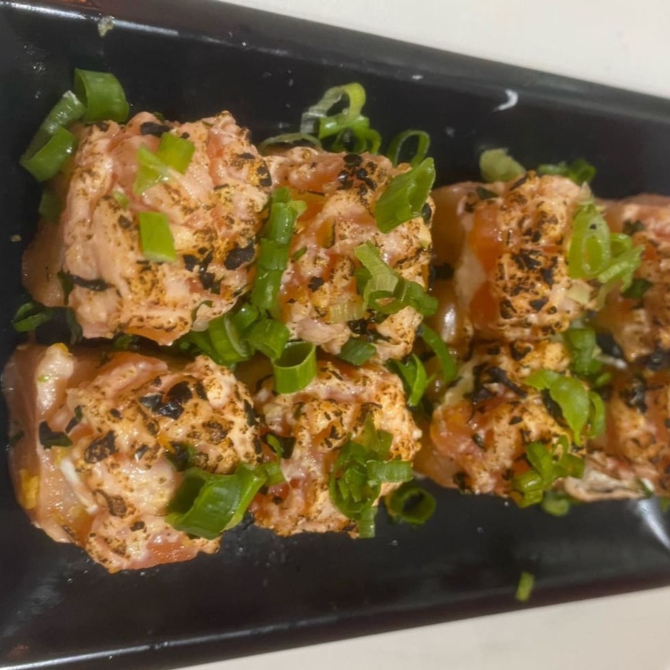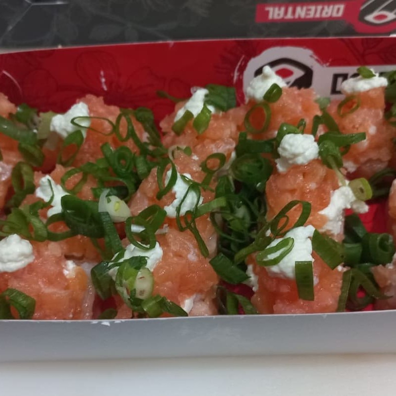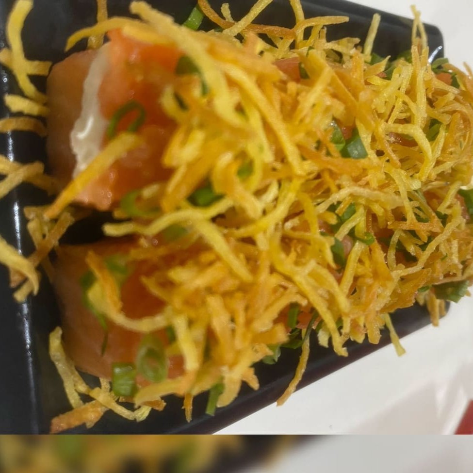 Hot holl de salmão cru em cubos com cream cheese cebolinha e molho tarê