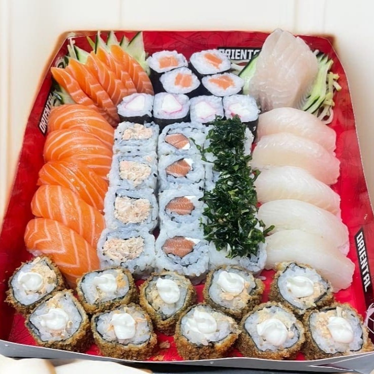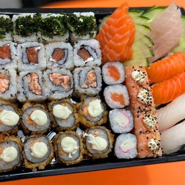 6 sashimi salmão,6 sashimi peixe branco, 12 hot roll, 4 uramaki Philadelphia, 4 uramaki salmão 4 uramaki skin, 4 uramaki Califórnia,4 hossamaki salmão 4 hossamaki kani, 4 djou salmão , 4 niguiri salmão, 4 niguiri peixe banco.