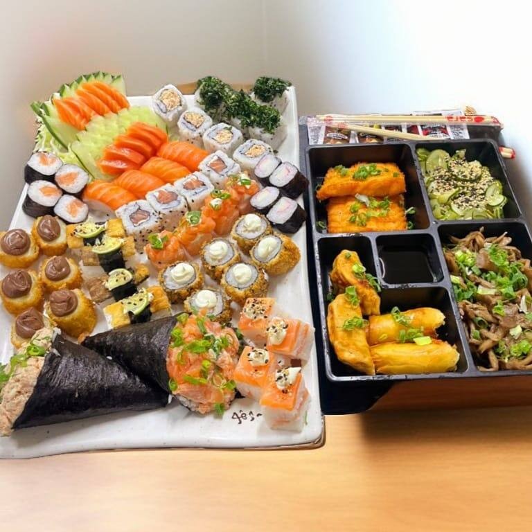 5 sashimi salmão, 2 niguiri salmão, 2 niguiri skim, 2 uramaki skim, 2 uramaki salmão, 2 djou salmão, 2 uramaki Philadelphia, 2 bateramaki, 2 hossomaki salmão, 4 hot holl salmão, 4 hot holl banana c/ chocolate, 1 temaki, 1 tepan salmão grelhado, 1 guiza carnesuina, 1 haromaki de Queijo, 1 porção de shimeji, 1 porção de sunomono.