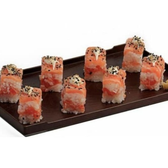 Camadas de arroz com recheio de salmão, cream cheese e cebolinha (8 unidades)