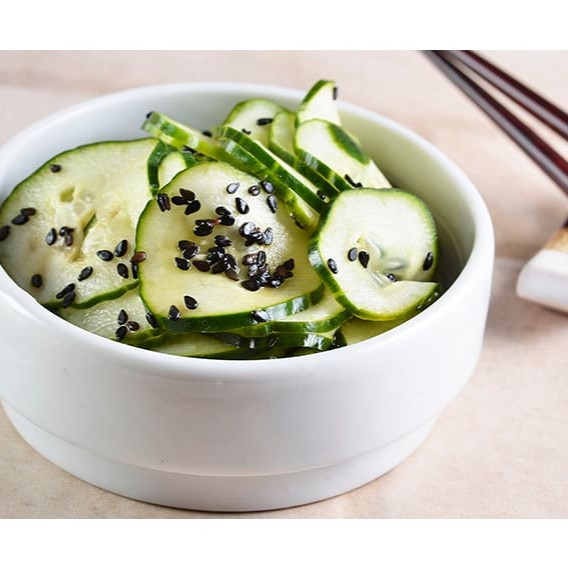 Pepino tipo japonês cortado em fatias finas com gergelim.