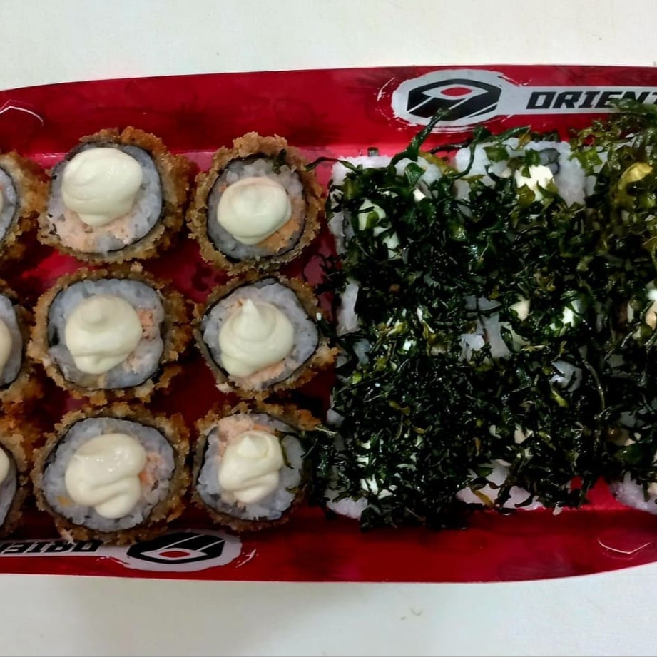6 sashimi salmão, 4 djou, 6 hot roll, 6 niguiri, 4 uramaki california, 2 hossomaki Kani, 2 hossomaki Pepino.