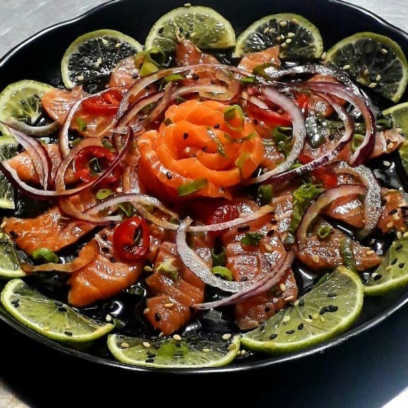 Salmão em cubos, tilápia em cubos, pimenta dedo de moça, pimentão, cebola roxa, molho a base de limão e laranja, azeite extra virgem.