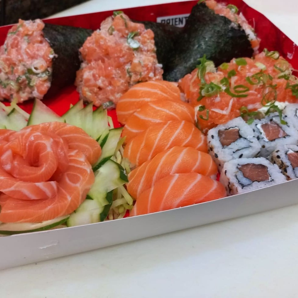 5 sashimi salmão,5 sashimi peixe branco, 10 hot roll, 5 niguiri salmão, 5 niguiri peixe branco, 4 uramaki Philadelphia, 4 uramaki skin, 4 uramaki salmão, 4 hossomaki salmão, 4 hossomaki Kani.