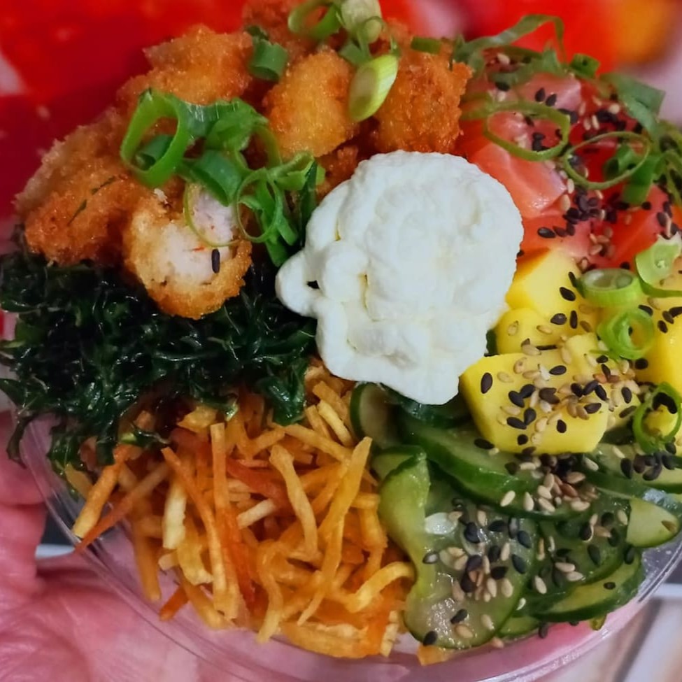 Base arroz japonés) salmão em cubos,camarão empanado, manga, sunomono, crispe de batata doce, couve crispe, cream cheese, cebolinha, e gergelim