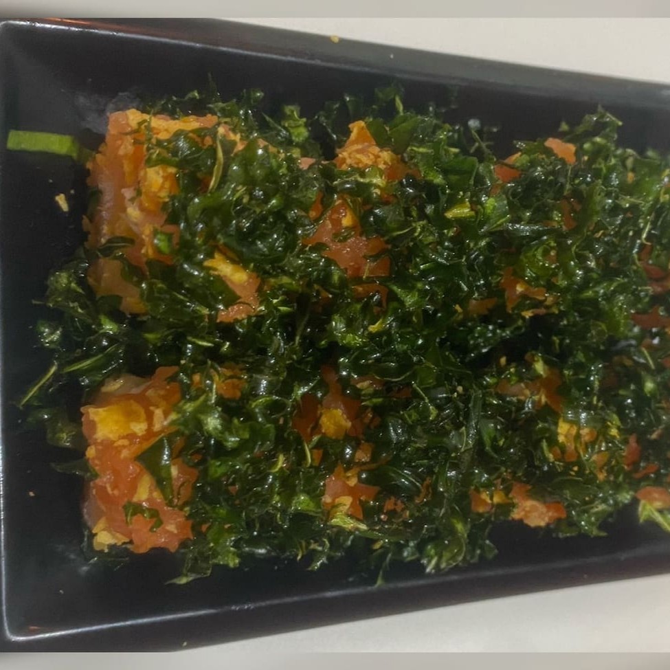 Tiras de salmão empanado, arroz, nori, cream cheese e couve frita.
