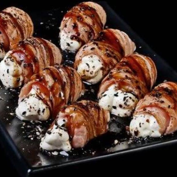Enrolado de salmão maçaricado com recheio de cream cheese cobertura de tarê e calda de maracujá.