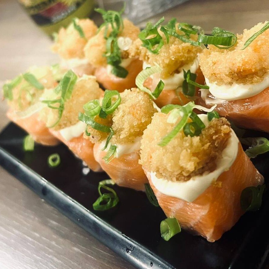 Enrolado por volta de salmão e recheio com salmão kani camarão cream chesse cebolinha e molho taê por cima.