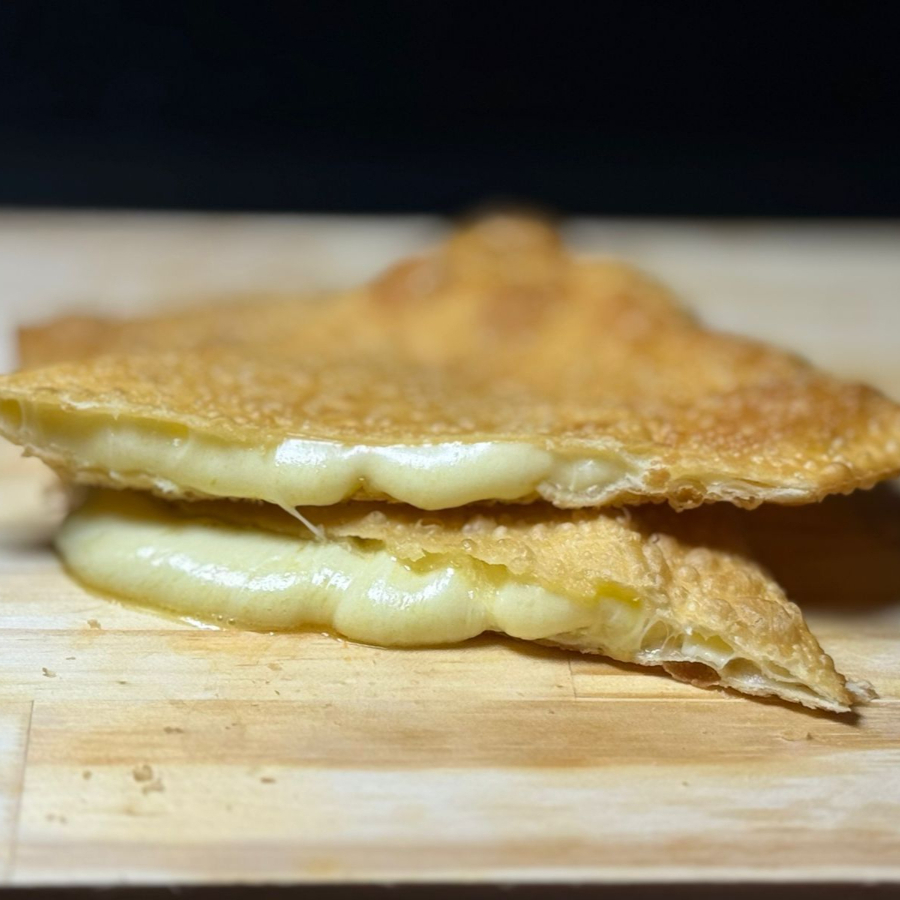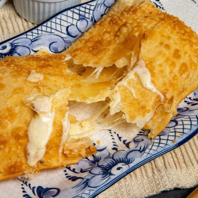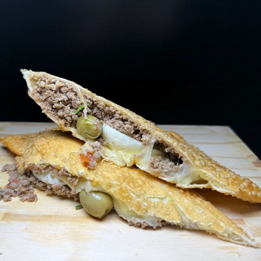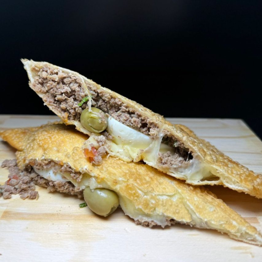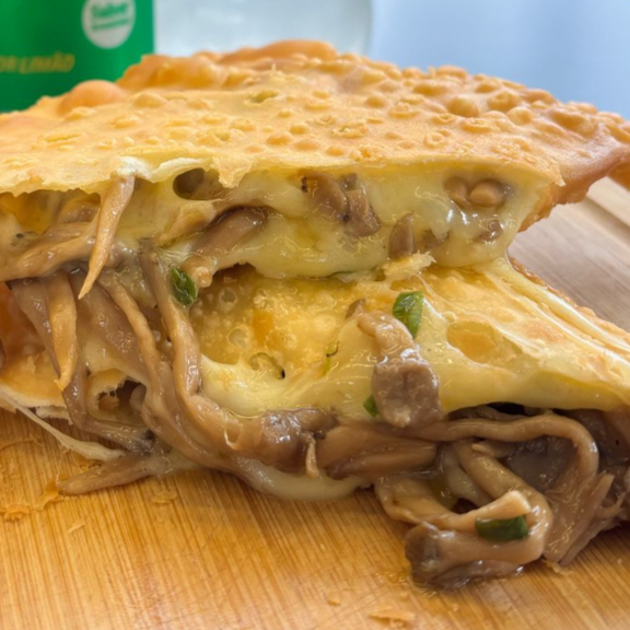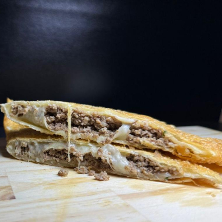 Um delicioso pastel (escolha o tamanho), produzido assim que você finaliza seu pedido, tendo como ponto forte o frescor e qualidade dos ingredientes. que vai com a carne moida com um tempero da casa e mussarela