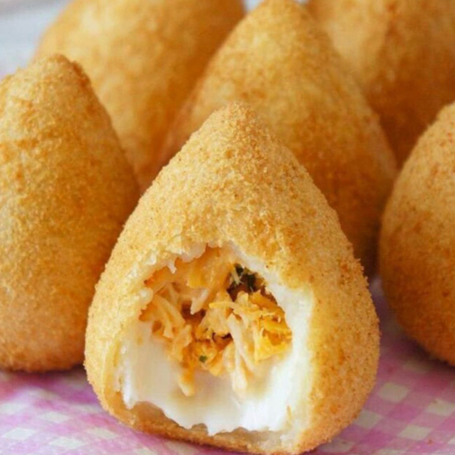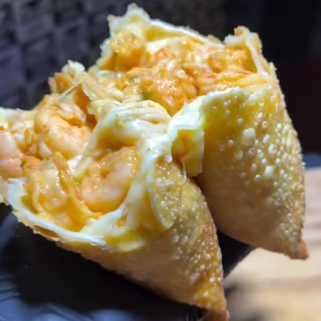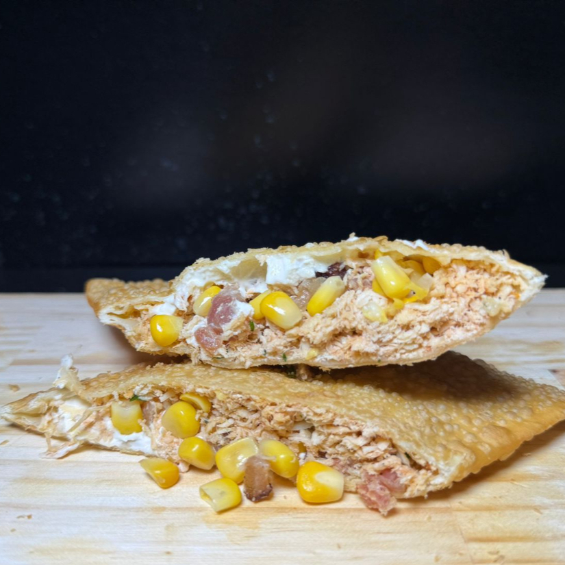 Um delicioso pastel (escolha o tamanho), produzido assim que você finaliza seu pedido, tendo como ponto forte o frescor e qualidade dos ingredientes. que vai frango desfiado com o tempero da casa, milho, becon, catupiry.